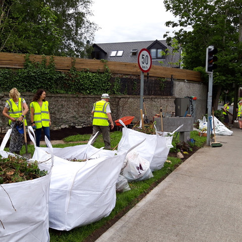 Yesterday over 20 volunteers worked outside the Phoenix Park gates leading to Castleknock. In 2 hours, they planted up along the railings and under the granite stone. And they cleared back the ivy which was covering the path again and trimmed plenty of low hanging branches along Castleknock Road. They filled SEVEN one-ton bags of compostable waste. Well done and thank you to everyone who volunteered. And welcome to all our new volunteers, more arriving each week! Then it was back to Myo's afterwards to enjoy a cup of tea and treats from Silver Spoon. Thanks!