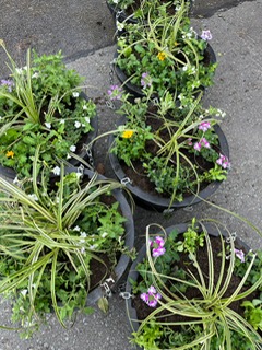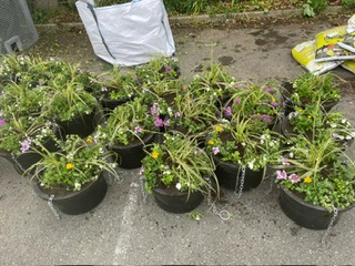 Teams of volunteers worked in an orderly assembly line, using tables in Myo's car park. First, a mix of soil and compost was used to fill the baskets, then a carefully selected mix of plants (for colour and pollinators) were potted up. Then we gave the baskets a first watering. As these 7-day reservoir baskets were ready, they were taken across the street to be hung on the brackets at Ashleigh Retail Centre. The baskets are connected by drip system into the water supply of the buildings and are watered once or twice a week and then retain the water under the plants.
