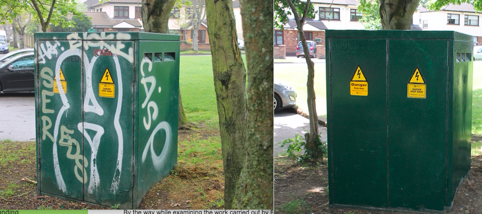 After being tracked down by the Castleknock Tidy Towns 'Taskforce Tidy Up Team', ESB Networks have today repainted all of their installations around Castleknock which were graffitied and dirty. Well done Declan Mescall, for taking such a committed lead on this!